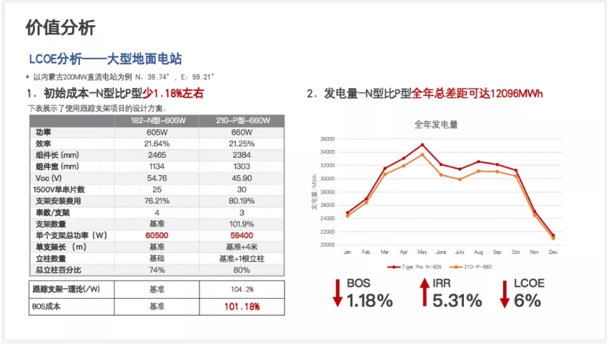 以?xún)?nèi)蒙某200MW電站為例,Tiger Neo-605W與常規(guī)210PERC產(chǎn)品660W對(duì)比來(lái)看,其BOS成本可降低1.18%左右,度電成本下降6%,IIR可提高5.31%。叢秋實(shí)表示,目前主流支架廠家、逆變器廠家的相關(guān)產(chǎn)品已經(jīng)可以全面適配以N型組件構(gòu)建的光伏系統(tǒng)。