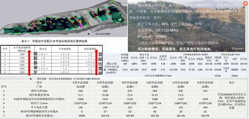 惠星舉例道“西北某100MW電站,選址于5000畝左右的山地,但實(shí)際可利用面積僅為2200多畝,在以項(xiàng)目收益率為底線的情況下測(cè)算,其適合的融配比在1.5左右,但有限的土地不足以布置更多的直流側(cè)裝機(jī)。但是,在采用N型組件后,疊加柔性支架技術(shù)等多種方案組合,其收益率測(cè)算達(dá)標(biāo)。如果不采用方案,該項(xiàng)目可能就推進(jìn)不下去了。”