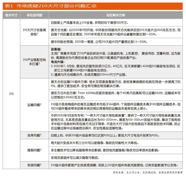 市場接受度且先不談,對于光伏組件廠家來說,這兩條路徑選擇的最大沖突集中于投入成本和風(fēng)險上。如果選擇第一條路徑,相對來說,廠家需要耗費產(chǎn)線升級及相關(guān)人力投入的成本,但第二條路徑卻需要新建產(chǎn)線乃至廠房,其中購買新設(shè)備就是一筆大投入。兩相比較,后者投入的成本更高、冒的風(fēng)險更大。這也是在初期天合光能在行業(yè)內(nèi)倡導(dǎo)生產(chǎn)和使用210硅片卻得不到上下產(chǎn)業(yè)鏈支持的主要原因。如今,經(jīng)過兩年多的努力,天合光能將210硅片的盟友發(fā)展到39家,包括上游供應(yīng)商、下游應(yīng)用客戶乃至同行。目前,182硅片和210硅片兩條路線已經(jīng)成為未來光伏組件廠家拓展大尺寸市場的選擇。但相比于182硅片,210硅片的“大躍進”也讓其充滿質(zhì)疑,比如在設(shè)備兼容性、產(chǎn)業(yè)鏈配套、運輸、良率、熱斑等等方面。根據(jù)浙商證券整理,如表1所示,天合光能、中環(huán)股份、晶盛機電、上機數(shù)控、愛旭股份、通威集團、東方日升等上下游已經(jīng)就210大尺寸存在的問題進行研發(fā)、解決。