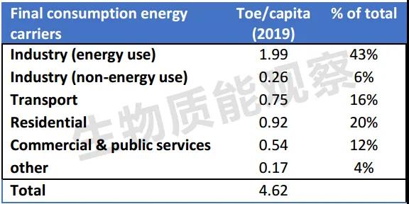 表1. 2019年芬蘭全行業(yè)人均能源最終消費分布。