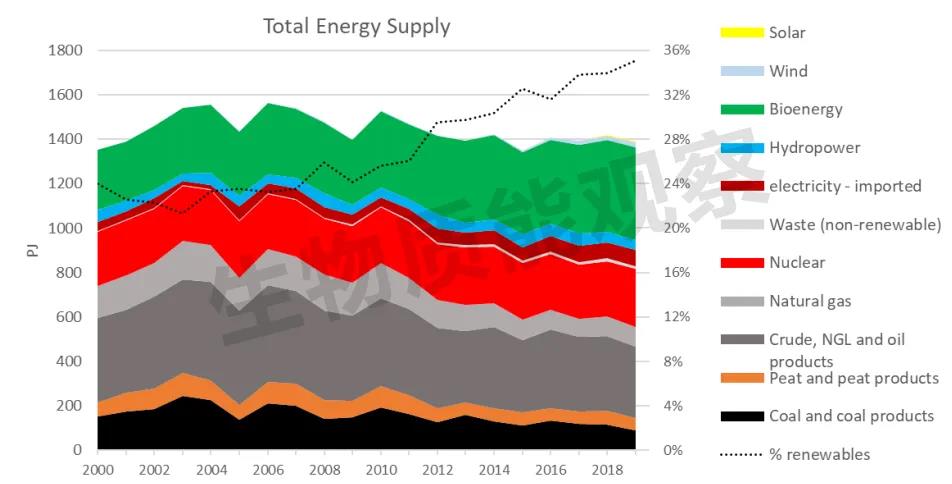 圖2:2000年至2019年芬蘭生物質(zhì)能供應(yīng)量及組成
