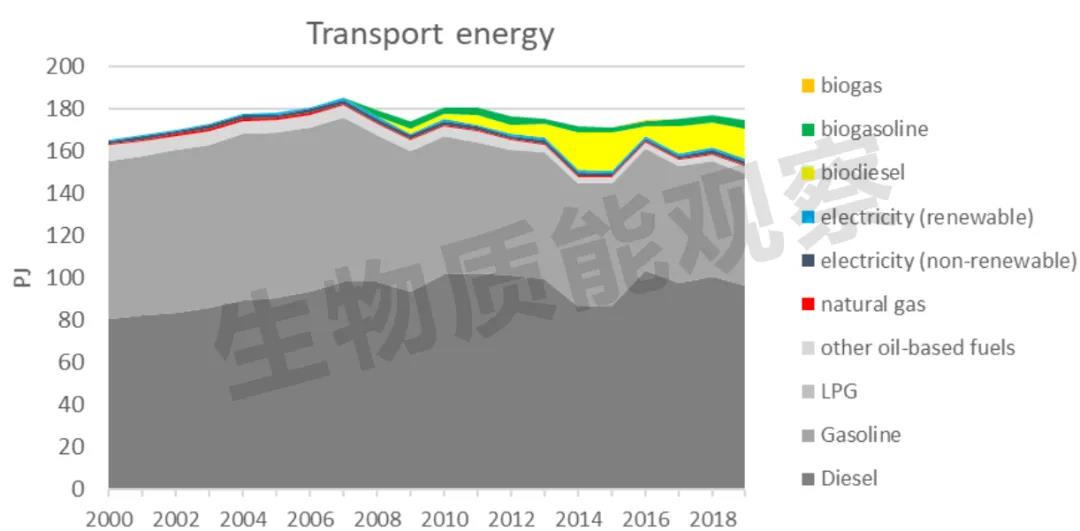 生物液體燃料于 2008 年推出,其使用量在最初幾年逐漸增加。從 2013 年到 2014 年,生物柴油從 6 PJ 增加到 18 PJ,2019 年生物柴油占柴油燃料消耗的 13%。生物燃料乙醇在過去 10 年中在 2.5 到 3.5 PJ 之間波動,占當(dāng)前汽油消耗的6.5%。