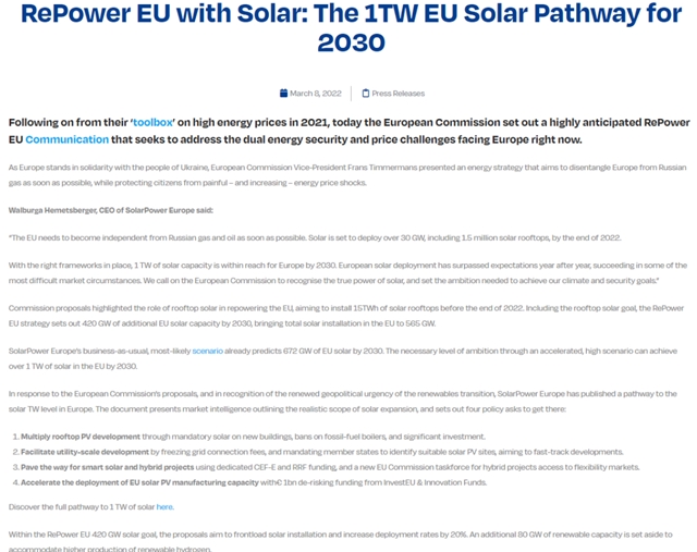近日,國際能源價(jià)格飆升,油價(jià)、天然氣創(chuàng)歷史新高,能源安全再次被各國重新定義。在此背景下,3月8日SolarPower Europe 官網(wǎng)發(fā)布了題為“RePower EU with Solar: The 1TW EU Solar Pathway for 2030”的信息。