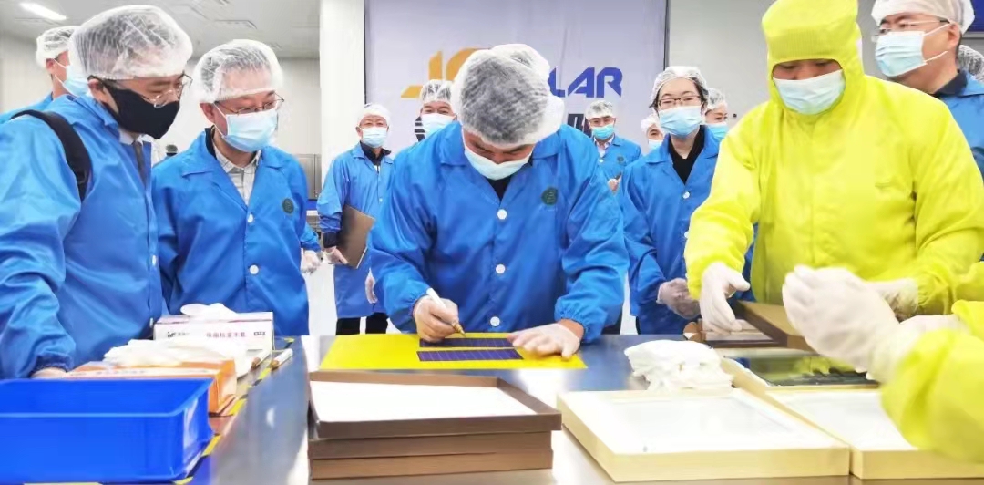 歐昊集團(tuán)董事長(zhǎng)張棟梁先生在210大尺寸異質(zhì)結(jié)首片下線電池上簽字留念