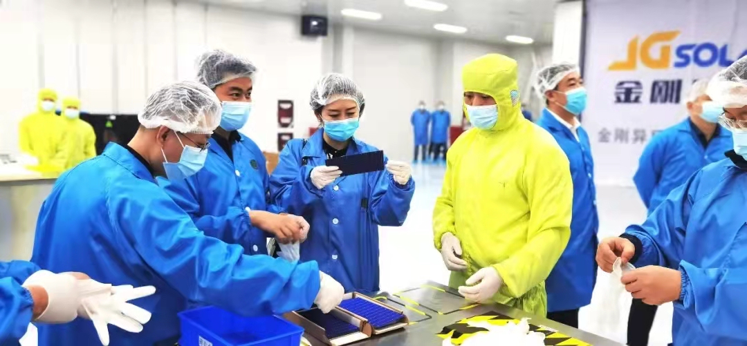 隨行領(lǐng)導(dǎo)詳細(xì)了解異質(zhì)結(jié)電池生產(chǎn)工藝及電池結(jié)構(gòu)