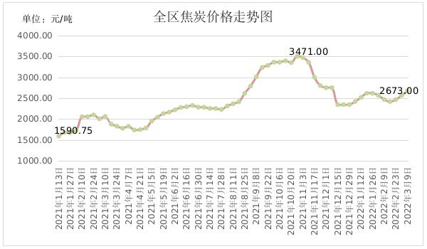 在需求向好和成本推動(dòng)的共同作用下,本周焦炭?jī)r(jià)格繼續(xù)小幅上漲。3月9日,全區(qū)焦炭平均出廠價(jià)格為2673.00元/噸,環(huán)比上漲4.19%,同比上漲29.65%。