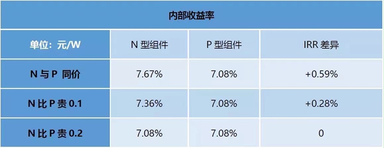 1. 假如N型組件與P型組件價(jià)格相同,那么可以為項(xiàng)目帶來IRR提升0.59%。