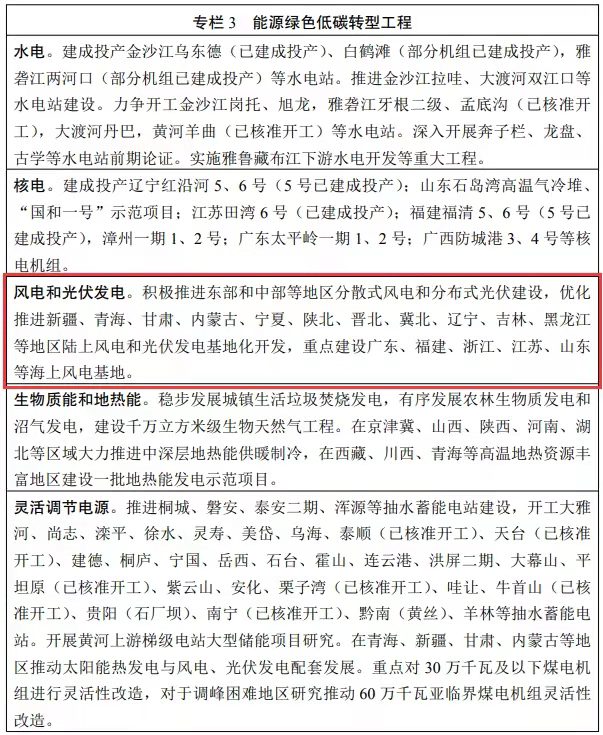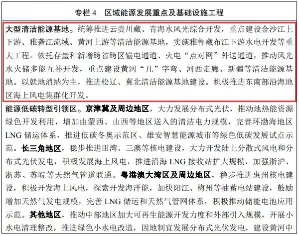在風(fēng)能和太陽(yáng)能資源稟賦較好、建設(shè)條件優(yōu)越、具備持續(xù)整裝開(kāi)發(fā)條件、符合區(qū)域生態(tài)環(huán)境保護(hù)等要求的地區(qū),有序推進(jìn)風(fēng)電和光伏發(fā)電集中式開(kāi)發(fā),加快推進(jìn)以沙漠、戈壁、荒漠地區(qū)為重點(diǎn)的大型風(fēng)電光伏基地項(xiàng)目建設(shè),積極推進(jìn)黃河上游、新疆、冀北等多能互補(bǔ)清潔能源基地建設(shè)。積極推動(dòng)工業(yè)園區(qū)、經(jīng)濟(jì)開(kāi)發(fā)區(qū)等屋頂光伏開(kāi)發(fā)利用,推廣光伏發(fā)電與建筑一體化應(yīng)用。開(kāi)展風(fēng)電、光伏發(fā)電制氫示范。鼓勵(lì)建設(shè)海上風(fēng)電基地,推進(jìn)海上風(fēng)電向深水遠(yuǎn)岸區(qū)域布局。積極發(fā)展太陽(yáng)能熱發(fā)電。