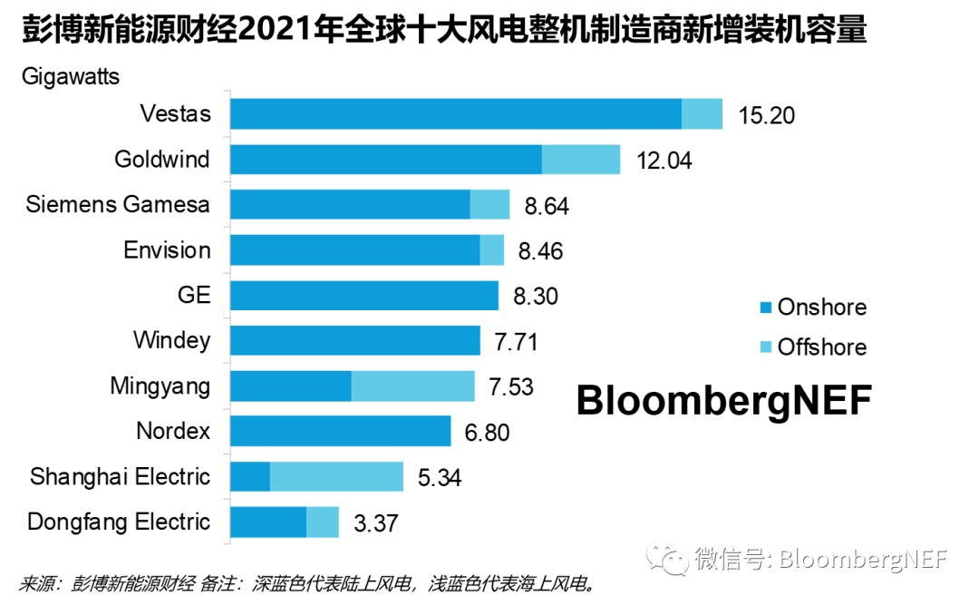 風(fēng)芒能源獲悉,3月23日,彭博新財(cái)經(jīng)發(fā)布2021年全球風(fēng)電整機(jī)制造商市場(chǎng)份額排名。