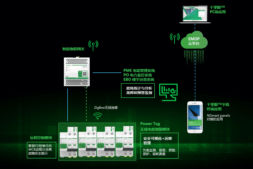 在數(shù)字化、智能化電網(wǎng)前景下,終端配電智能化升級也將成為趨勢。作為配電領(lǐng)域的專家,施耐德電氣不斷創(chuàng)新,搭建由智能網(wǎng)關(guān)模塊、智能終端配電元件、應(yīng)用及管理平臺三部分構(gòu)成的終端配電智能化系統(tǒng),以實現(xiàn)數(shù)據(jù)采集、遠(yuǎn)程控制、可視化運(yùn)維管理,進(jìn)一步提高用戶運(yùn)維管理水平,監(jiān)測碳排放。