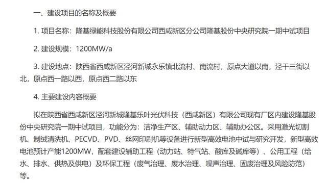 公告顯示,隆基綠能科技股份有限公司西咸新區(qū)分公司將在“陜西省西咸新區(qū)涇河新城永樂鎮(zhèn)北流村、南流村,原點大道以南,涇干三街以北,原點西一路以西,原點西二路以東”范圍內建設1200MW/a項目,為隆基股份中央研究院一期中試項目。