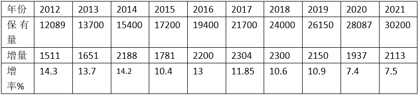 表1:表一2012-2021年我國汽車保有量(萬輛)
