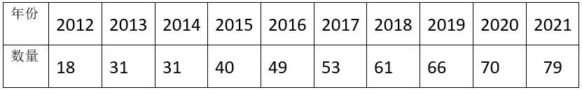 表二:2012-2021年汽車保有量上百萬輛的城市數(shù)量(個(gè))