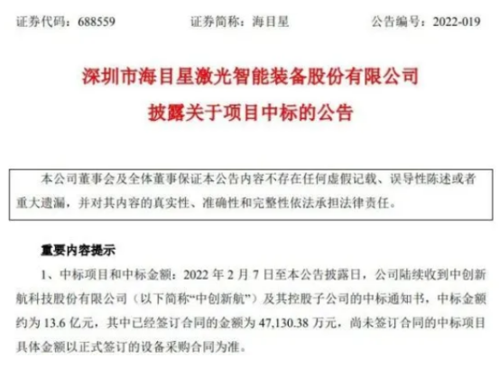 4月24日,海目星發(fā)布公告稱,2022年2月7日至本公告披露日,公司陸續(xù)收到中創(chuàng)新航及其控股子公司的中標(biāo)通知書,中標(biāo)項目為裝配段設(shè)備及生產(chǎn)線項目,中標(biāo)金額約為13.6億元。