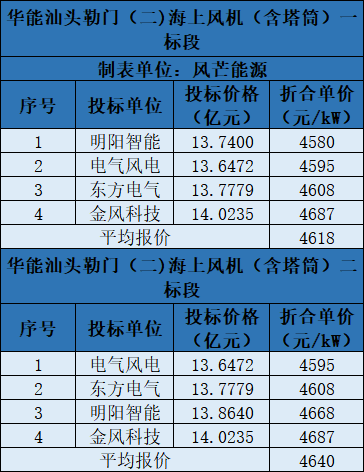 項(xiàng)目分兩個(gè)標(biāo)段,共有金風(fēng)、明陽(yáng)等4家整機(jī)商競(jìng)標(biāo)。項(xiàng)目投標(biāo)最低折合單價(jià)4580元/kW。
