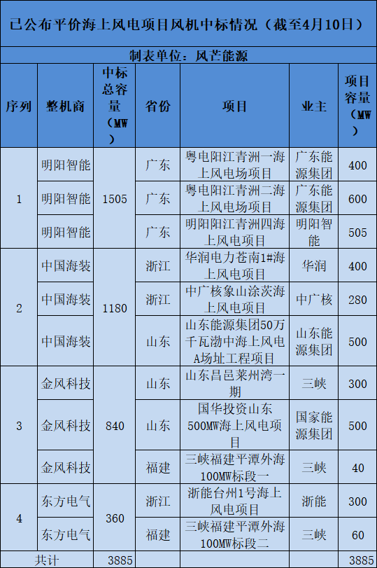風(fēng)芒能源根據(jù)公開(kāi)信息不完全統(tǒng)計(jì),截至目前,已有3.885GW平價(jià)海上風(fēng)電機(jī)組中標(biāo)。其中,拿標(biāo)超1GW的有明陽(yáng)智能、中國(guó)海裝2家整機(jī)商。明陽(yáng)智能拿標(biāo)最多,都集中在廣東地區(qū)。