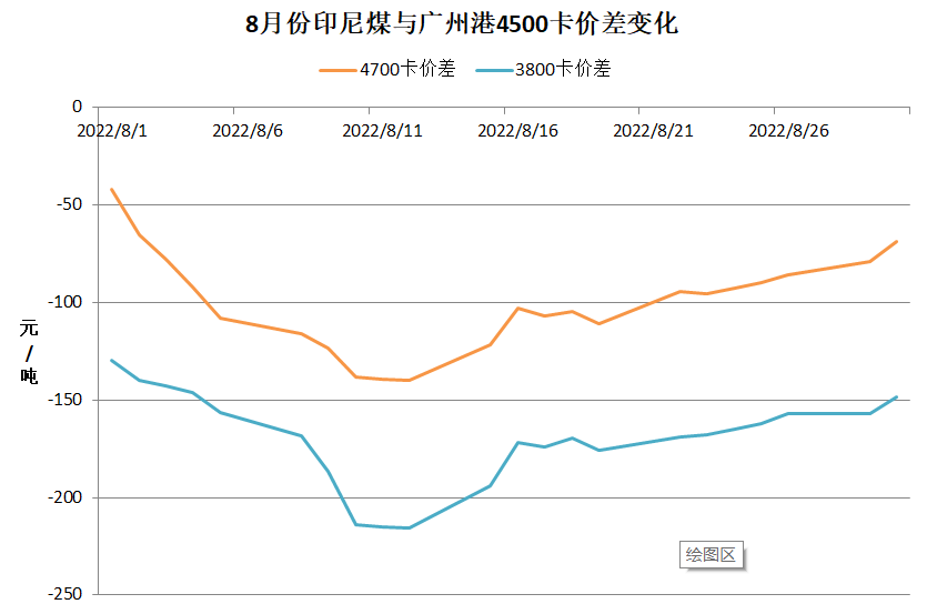 由于近期印尼煤到岸價(jià)持續(xù)反彈,而北方港內(nèi)貿(mào)煤價(jià)格雖也有上漲,但由于運(yùn)費(fèi)的下跌,抵消了煤價(jià)部分漲幅,因此導(dǎo)致印尼煤價(jià)格與內(nèi)貿(mào)煤價(jià)格的價(jià)差優(yōu)勢逐漸縮小。截至8月30日,印尼3800卡與廣州港內(nèi)貿(mào)4500卡價(jià)差最新已降至150元/噸,4700卡價(jià)差降至68元/噸。