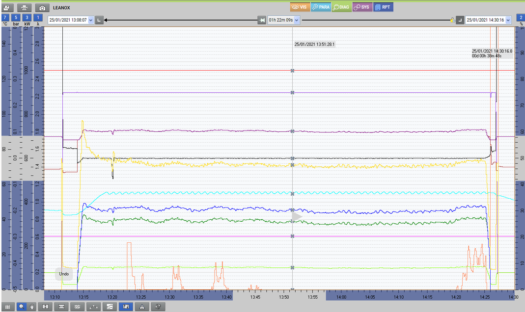 顏巴赫某工業(yè)沼氣發(fā)電項目用戶的機組突然報警顯示排煙溫度高,實時溫度顯示約600°C,比正常值超出約200°C,并且機組發(fā)電功率達(dá)不到設(shè)定值。收到遠(yuǎn)程報警信息后,顏巴赫技術(shù)專家立即會同授權(quán)服務(wù)商的工程師通過myPlant*系統(tǒng)分析機組的運行曲線。通過對故障發(fā)生時間段內(nèi)的運行曲線進(jìn)行調(diào)查發(fā)現(xiàn),機組顯示功率與設(shè)定值相比顯著下降。更反常的是與故障發(fā)生前的運行階段相比,機組的燃?xì)庀牟粶p反增,并且節(jié)氣門開度波動異常。這些跡象表明某些現(xiàn)場反饋信號可能有錯誤,導(dǎo)致控制系統(tǒng)不斷調(diào)節(jié)試圖提升功率。在基本明確故障原因后,服務(wù)商的工程師立刻聯(lián)系現(xiàn)場的機組運行人員使用儀表現(xiàn)場檢測機組發(fā)電功率,發(fā)現(xiàn)實際檢測功率遠(yuǎn)比顯示功率高。這說明機組實際上已經(jīng)滿負(fù)荷甚至超負(fù)荷運行,但是顯示功率存在錯誤。錯誤的信號導(dǎo)致機組自動調(diào)整時錯誤地加大了進(jìn)氣量,造成過量空氣系數(shù)下降以及Leanox正偏差,從而導(dǎo)致排溫升高。由于顯示功率來源于開關(guān)柜的CT和PT信號,于是授權(quán)服務(wù)商的工程師從功率采集來源入手,建議現(xiàn)場的機組運行人員排查CT線路,最終發(fā)現(xiàn)CT接線存在脫落情況。經(jīng)過現(xiàn)場處理,機組立即恢復(fù)了正常,輸出設(shè)定功率,排煙溫度也降至正常水平。