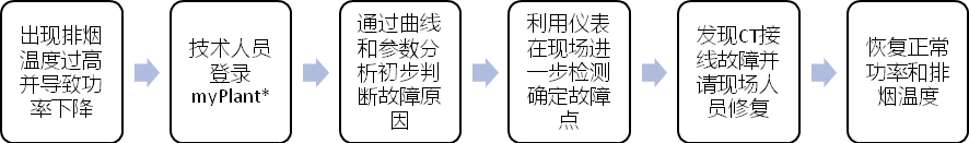 圖3 運用myPlant* 解決某用戶沼氣發(fā)電機組排煙溫度高且功率顯示異常問題過程示意圖