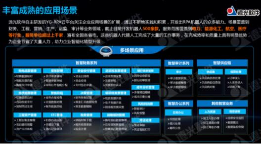 遠(yuǎn)光軟件基于YG-RPA云平臺已經(jīng)成功打造出數(shù)百款RPA機(jī)器人,應(yīng)用場景覆蓋到財(cái)務(wù)、工程、營銷、生產(chǎn)、運(yùn)監(jiān)、審計(jì)等業(yè)務(wù)領(lǐng)域,涉及行業(yè)囊括電力、能源化工、航空、醫(yī)療等,服務(wù)單位遍布全國各省市超過上千家,為企業(yè)節(jié)省了大量人力,推動企業(yè)管理變革和業(yè)務(wù)創(chuàng)新。