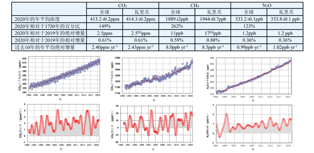 1990 年以來瓦里關(guān)站大氣 CO2、CH4、N2O 濃度(上圖)及其增長率(下圖) 上圖中的藍(lán)點表示月平均值,紅線為其線性擬合曲線;下圖中的紅點表示月增長率,灰色柱為增長率年平均二氧化碳