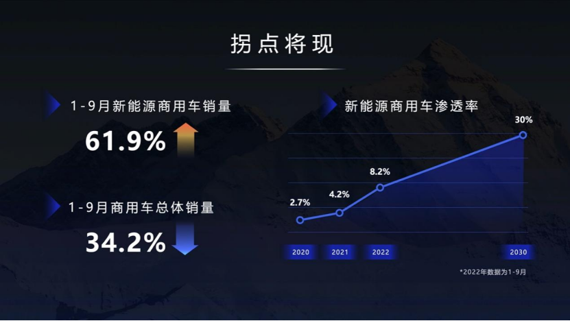 在這樣的背景下,商用車新能源轉(zhuǎn)型趨勢已成必然,傳統(tǒng)商用車銷量不斷下滑,但新能源商用車銷量逆勢增長,市場拐點已經(jīng)清晰可見。數(shù)據(jù)顯示,新能源商用車滲透率三年來呈現(xiàn)翻倍式增長,2020年滲透率僅為2.7%,2021年滲透率則為4.2%,今年1-9月新能源商用車行業(yè)銷量同比增長61.9%,滲透率達(dá)到8.2%。
