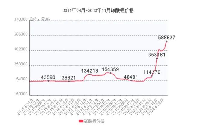 數(shù)據(jù)顯示,自11月電池級(jí)碳酸鋰價(jià)格行情正式突破60萬元/噸之后,截至目前持續(xù)高位盤整,相較去年年初,漲幅達(dá)到1057.7%,創(chuàng)下歷史新高記錄。對此,寧德時(shí)代等電芯大廠也曾多次喊話,碳酸鋰超過50萬元/噸,就無法承受,要采取反制措施。今年3月,寧德時(shí)代就被爆出減產(chǎn)的傳聞,當(dāng)時(shí)也正值碳酸鋰均價(jià)突破新高之際,但碳酸鋰的價(jià)格還是從年初的每噸27.8萬元上逼近到如今的60萬元關(guān)口。