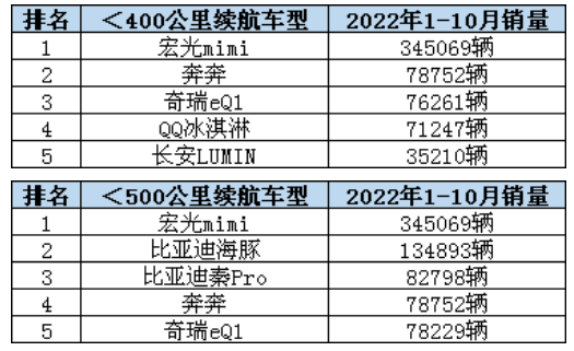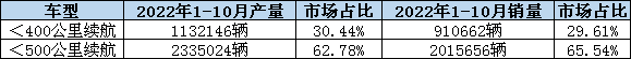 從國內(nèi)電動汽車產(chǎn)銷量看,動力電池應用分會數(shù)據(jù)顯示,2022年1-10月國內(nèi)400公里以下續(xù)航車型產(chǎn)量占電動車市場的30.44%,500公里以下續(xù)航車型占62.78%;銷量占比也基本保持同頻,400公里和500公里以下續(xù)航車型銷量分別占29.61%和65.54%。