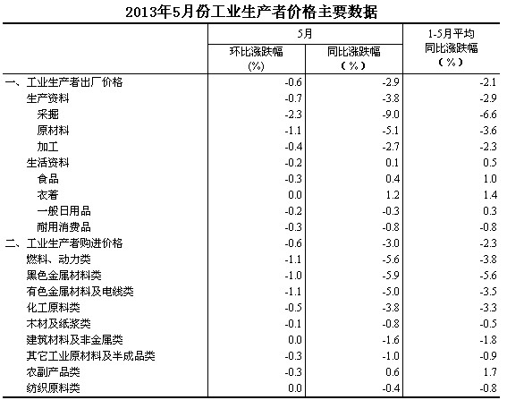 2013年5月份,全國(guó)工業(yè)生產(chǎn)者出廠價(jià)格同比下降2.9%,環(huán)比下降0.6%。工業(yè)生產(chǎn)者購(gòu)進(jìn)價(jià)格同比下降3.0%,環(huán)比下降0.6%。1-5月平均,工業(yè)生產(chǎn)者出廠價(jià)格同比下降2.1%,工業(yè)生產(chǎn)者購(gòu)進(jìn)價(jià)格同比下降2.3%。
