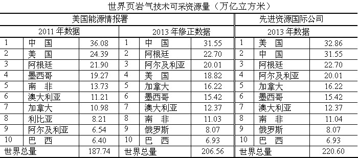 ⑴根據(jù)兩家對頁巖氣技術(shù)可采資源量評價,排名位置明顯變動。美國能源情報署2013年將中國頁巖氣技術(shù)可采資源量調(diào)低了4.5萬億立方米,但仍居世界第一,而美國調(diào)低了5.5萬億立方米,位居世界第四。按ARI評價,美國為第一位,中國為第二位。