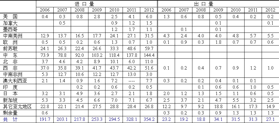 2006-2012年中國石油進(jìn)出口量及來源(單位:百萬噸)
