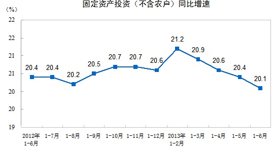 2013年1-6月份,全國固定資產(chǎn)投資(不含農(nóng)戶)181318億元,同比名義增長20.1%(扣除價格因素實際增長20.1%),增速比1-5月份回落0.3個百分點。從環(huán)比看,6月份固定資產(chǎn)投資(不含農(nóng)戶)增長1.51%。