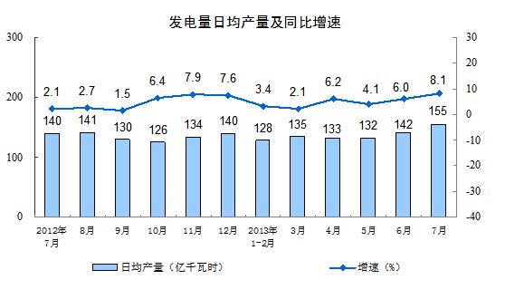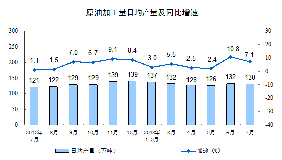 分產(chǎn)品看,7月份,464種產(chǎn)品中有306種產(chǎn)品同比增長。其中,發(fā)電量4795億千瓦時,同比增長8.1%;鋼材9075萬噸,增長10.9%;水泥21182萬噸,增長9.1%;原油加工量4030萬噸,增長7.1%;十種有色金屬335萬噸,增長9.8%;乙烯132萬噸,增長10.1%;汽車170.8萬輛,增長15.4%;轎車98.5萬輛,增長11.9%。