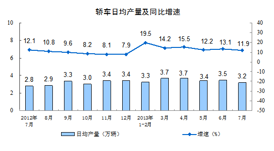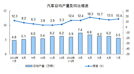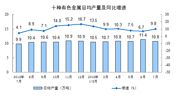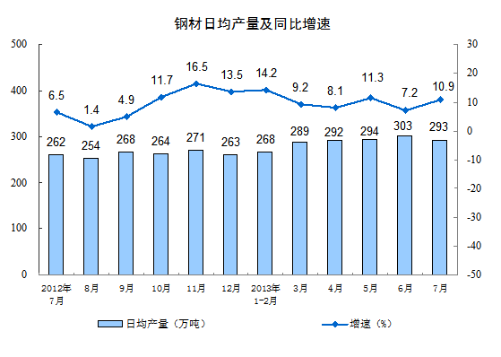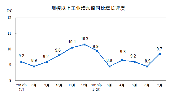 2013年7月份,規(guī)模以上工業(yè)增加值同比實際增長9.7 %(以下增加值增速均為扣除價格因素的實際增長率),比6月份加快0.8個百分點。從環(huán)比看,7月份,規(guī)模以上工業(yè)增加值比上月增長0.88%。1-7月,規(guī)模以上工業(yè)增加值同比增長9.4%。