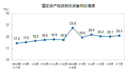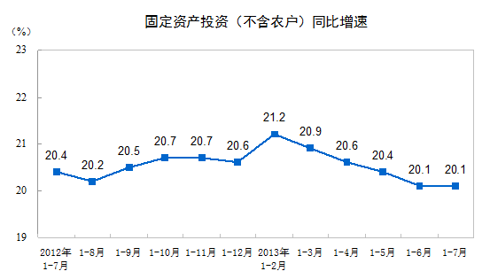 2013年1-7月份,全國固定資產投資(不含農戶)221722億元,同比名義增長20.1%,增速與1-6月份持平。從環(huán)比看,7月份固定資產投資(不含農戶)增長1.58%。