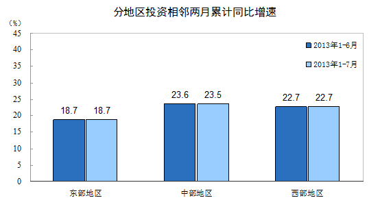 分地區(qū)看,1-7月份,東部地區(qū)投資105507億元,同比增長18.7%,增速與上月持平;中部地區(qū)投資61104億元,增長23.5%,增速比1-6月份回落0.1個百分點;西部地區(qū)投資53963億元,增長22.7%,增速與上月持平。
