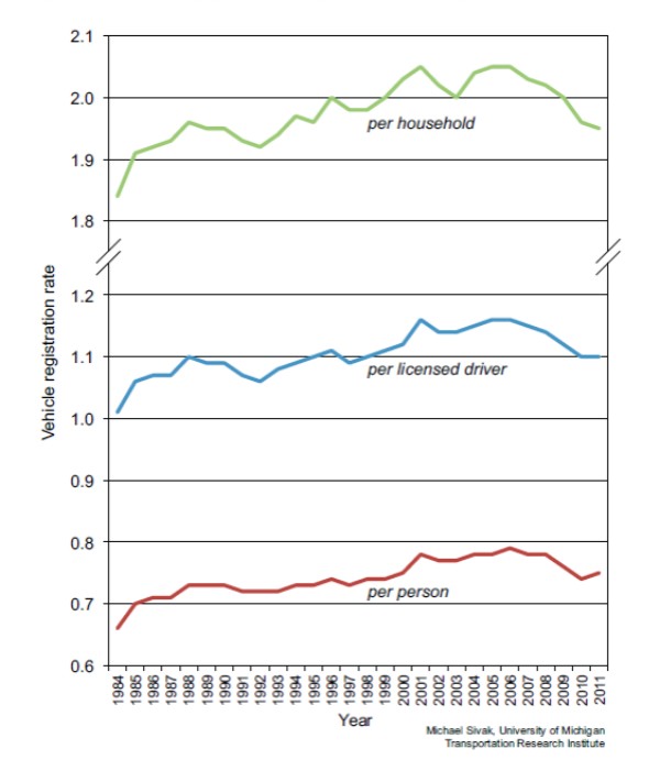 美國(guó)每個(gè)家庭、每個(gè)有牌照的駕駛員和每個(gè)人的登記輕型汽油車數(shù)量。數(shù)據(jù)來源:Sivak(2013)
