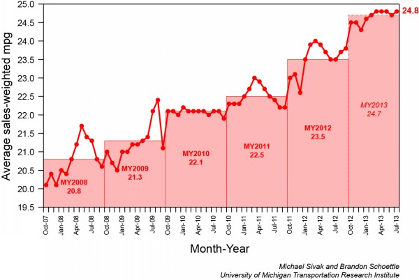 美國(guó)新出售輕型汽油車每加侖汽油平均的行駛里程。數(shù)據(jù)來源:UMTRI