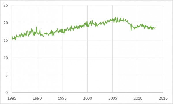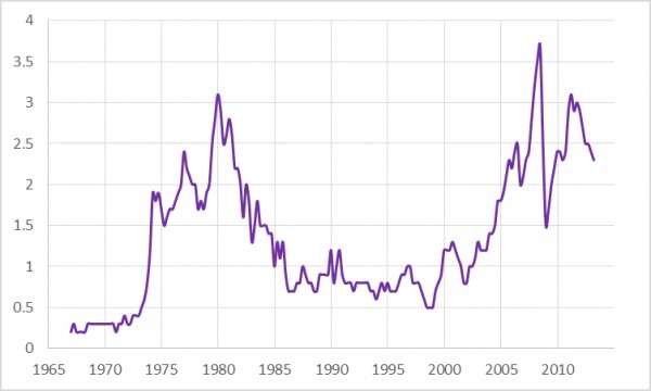 1967年一季度至2013年二季度,美國(guó)進(jìn)口汽油產(chǎn)品的美元價(jià)值占GDP的比重。數(shù)據(jù)來源于美聯(lián)儲(chǔ)