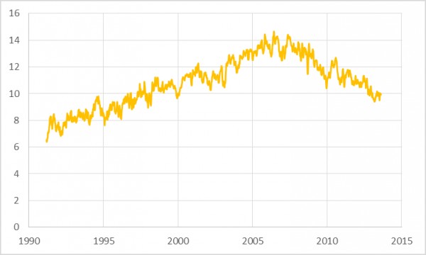 1991年3月8日至2013年8月23日,美國(guó)原油和汽油產(chǎn)品的四周平均總進(jìn)口量(百萬桶/天)。數(shù)據(jù)來源:美國(guó)能源信息署。