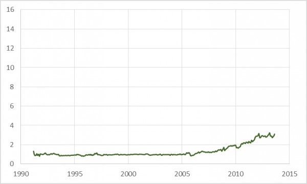 如下圖所示,以2013年美元的價(jià)值計(jì)算,1947年1月至2013年7月的真實(shí)油價(jià)水平:1947-1989年基于美聯(lián)儲(chǔ)經(jīng)濟(jì)數(shù)據(jù)的WTI油價(jià);1990-2013年基于美國(guó)能源信息署的布倫特油價(jià),利用CPI數(shù)據(jù)轉(zhuǎn)換成當(dāng)今的美元價(jià)值。