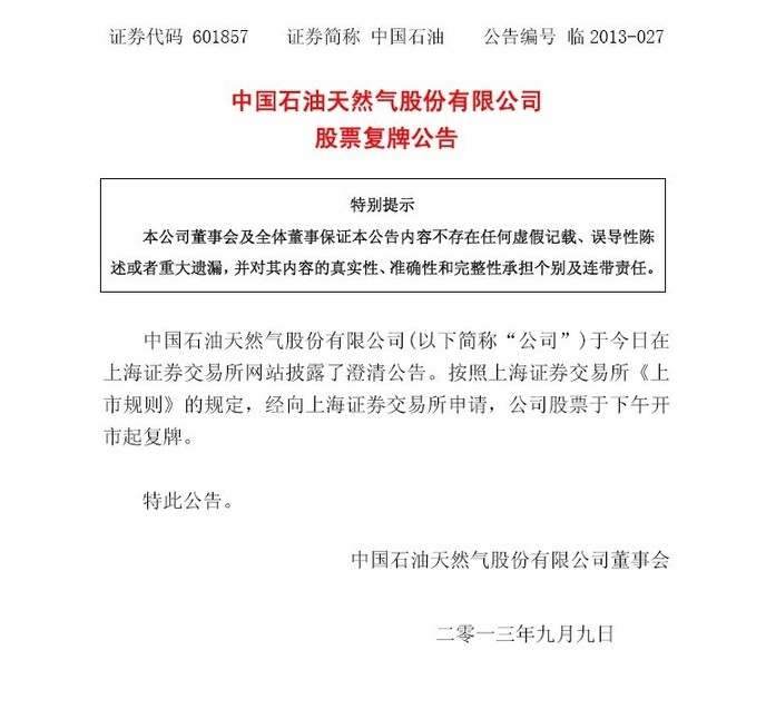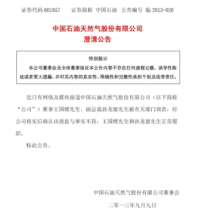 據(jù)上交所網站,中國石油天然氣股份有限公司在今日午間發(fā)布兩份公告稱,近日有網絡及媒體報道中國石油天然氣股份有限公司董事王國梁、副總裁孫龍德被有關部門調查,經公司核實后確認該消息與事實不符,王國梁和孫龍德正常履職。按照上海證券交易所《上市規(guī)則》的規(guī)定,經過上海證券交易所申請,該公司股票于下午開始起復牌。