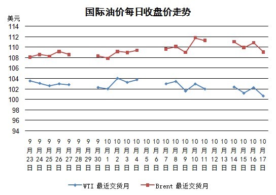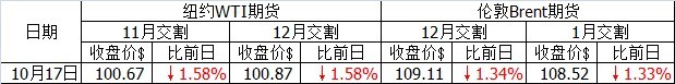 倫敦布倫特11月交割期貨當(dāng)日到期。前一日在美國(guó)債務(wù)違約回避、政府決定重新開(kāi)門(mén)之后,油價(jià)反彈,然而10月17日國(guó)際油價(jià)卻轉(zhuǎn)頭直下。美國(guó)股市當(dāng)日下跌也帶動(dòng)油價(jià)下跌。