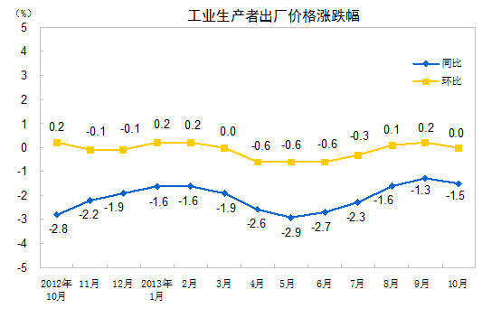 2013年10月份,全國工業(yè)生產(chǎn)者出廠價格同比下降1.5%,環(huán)比持平(漲跌幅度為0,下同)。工業(yè)生產(chǎn)者購進價格同比下降1.6%,環(huán)比上漲0.1%。1-10月平均,工業(yè)生產(chǎn)者出廠價格同比下降2.0%,工業(yè)生產(chǎn)者購進價格同比下降2.1%。