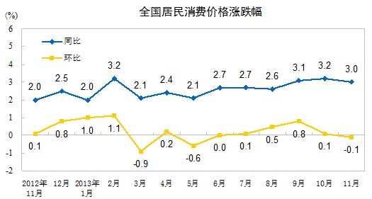 2013年11月份,全國居民消費(fèi)價(jià)格總水平同比上漲3.0%。其中,城市上漲3.0%,農(nóng)村上漲3.1%;食品價(jià)格上漲5.9%,非食品價(jià)格上漲1.6%;消費(fèi)品價(jià)格上漲2.9%,服務(wù)價(jià)格上漲3.3%。1-11月平均,全國居民消費(fèi)價(jià)格總水平比去年同期上漲2.6%。