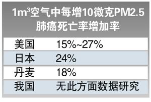 關(guān)于灰霾對人體健康的影響,鐘南山說,發(fā)達(dá)國家已做了13~20年的研究。美國的研究發(fā)現(xiàn),一立方米空氣中每增加10微克的PM2.5顆粒,肺癌的死亡率就增加15%~27%,日本的研究數(shù)據(jù)是增加24%,丹麥的研究數(shù)據(jù)是增加18%。設(shè)在法國里昂的國際癌癥研究機構(gòu)在報告中說,有充足證據(jù)顯示,暴露于戶外空氣污染中會導(dǎo)致肺癌,而且患膀胱癌的風(fēng)險會相應(yīng)增加。“從這些數(shù)字可以看出,灰霾天氣與肺癌有很明顯的關(guān)系。”