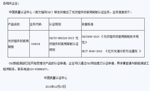 據(jù)了解,新認(rèn)證業(yè)務(wù)代碼為024014,采用的認(rèn)證規(guī)則為CQC3308-2013《光伏組件封裝用背板技術(shù)規(guī)范》,依據(jù)測(cè)試標(biāo)準(zhǔn)為CQC-2013《光伏組件封裝用背板技術(shù)規(guī)范》以及GB/T 6040-2002 《紅外光譜分析方法通則》。