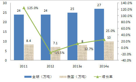 圖1 2011-2014年我國多晶硅產(chǎn)量、增長率及全球多晶硅產(chǎn)量