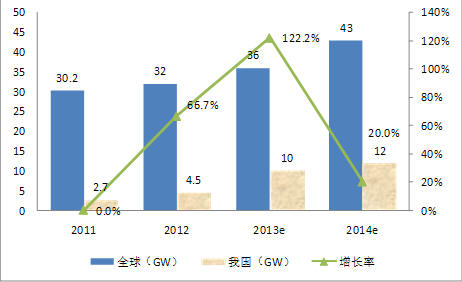 圖3 2011-2014年我國光伏新增裝機(jī)量、增長率及全球新增裝機(jī)量