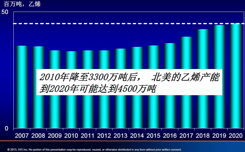 IHS預計北美乙烯產(chǎn)能在2020年可能達到4500萬噸,這很可能成為北美自2010年產(chǎn)量跌至谷底3300萬噸后的一次漂亮扭轉。